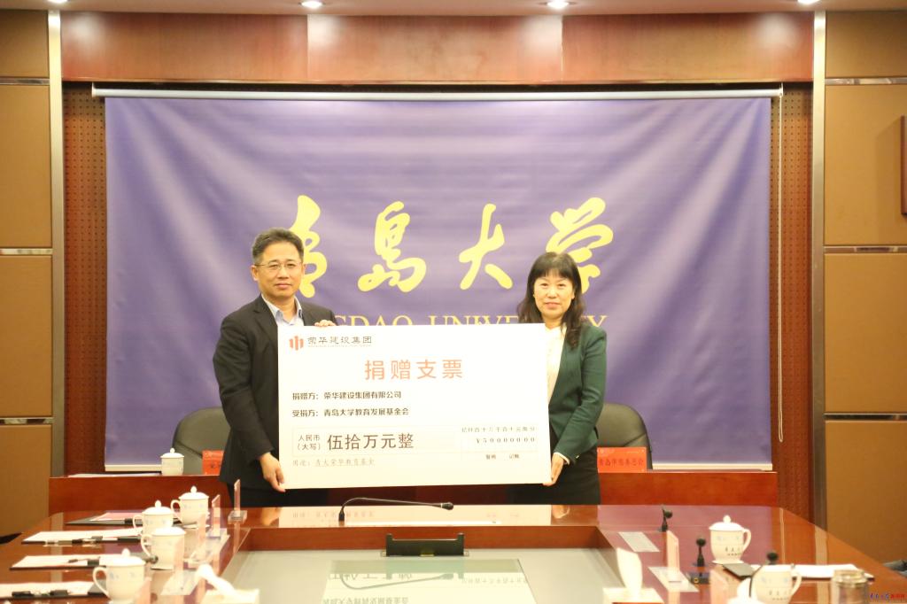 王偉代表青島市慈善總會對榮華建設集團向青島大學的再次捐贈表示熱烈祝賀。他說,青島大學是以青島城市命名的高等學府,匯聚了青島城市的百年文脈,青島大學的發展史,就是青島這個城市的發展史。青島的發展,離不開青島大學人才等各方面的支持。青島大學對青島的貢獻有目共睹,青島大學的發展也代表了青島這個城市的發展。孫涌董事長是個有社會責任感、有愛心的企業家。匠心和善心,代表了榮華集團最重要的品質。榮華集團再次向青島大學捐資,代表著社會對青島大學的向往和期盼,充分彰顯了榮華建設集團強烈的社會責任感和非凡的企業發展戰略眼光。市慈善總會非常愿意為所有熱心慈善的企業和個人提供服務,牽線搭橋,從而推動全市慈善事業更好更快的發展,推動青島城市更加溫暖、更加燦爛、更加高尚。祝青島大學和榮華的校企合作結出豐碩成果,生生不息,長長久久。希望青島大學繼續砥礪奮進,一步一個腳印地在“雙一流”大學建設中取得新突破。
