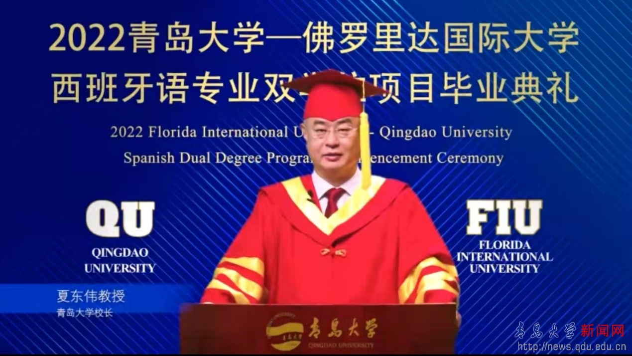 夏東偉在致辭中首先向圓滿完成學業(yè)的畢業(yè)生們表示祝賀,并向付出了辛勤勞動的兩校教職員工和關(guān)心支持青島大學的社會各界朋友表示衷心感謝。他介紹了青島大學的辦學特色和所得成就,以及與佛羅里達國際大學聯(lián)合舉辦西班牙語專業(yè)(拉美貿(mào)易方向)本科雙學位教育項目的合作辦學歷史。并對本屆畢業(yè)生寄予了殷切的期望:第一,堅守與時代同脈的高遠理想,心系民族命運,關(guān)注國家大事,在實現(xiàn)民族復興的宏偉事業(yè)中奉獻自己的青春年華;第二,厚植與時代同行的家國情懷,注重修身齊家,強化責任擔當,在實現(xiàn)新時代的夢想中譜寫無悔的青春之歌;第三,練就與時代同進的過硬本領(lǐng),變革思維方式,提升能力本領(lǐng),在實現(xiàn)青春夢想中展示絢麗多彩的人生才華;第四,成為世界文化交流的推動者,發(fā)揮專業(yè)所長,為建設人類命運共同體的偉大夢想貢獻自己的力量。最后,夏東偉校長祝愿每一個畢業(yè)生都能勇往直前,鵬程萬里,不辜負這個偉大的新時代,也祝愿兩校友誼天長地久,合作再結(jié)碩果。