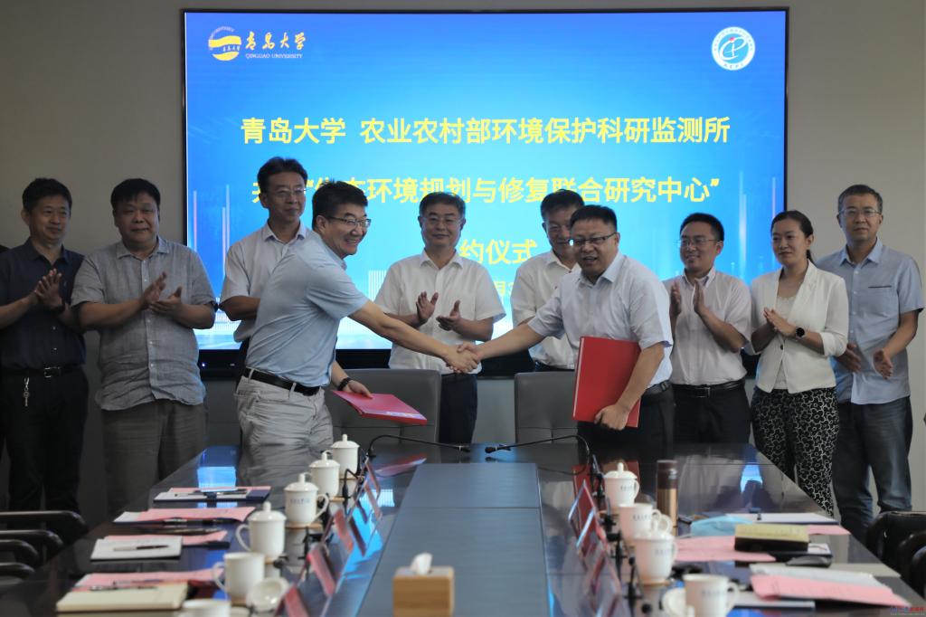 我校環境科學與工程學院院長佘希林與環境保護科研監測所綜合辦公室(人事處)處長王農共同簽訂《青島大學 農業農村部環境保護科研監測所共建“生態環境規劃與修復聯合研究中心”合作協議》。
