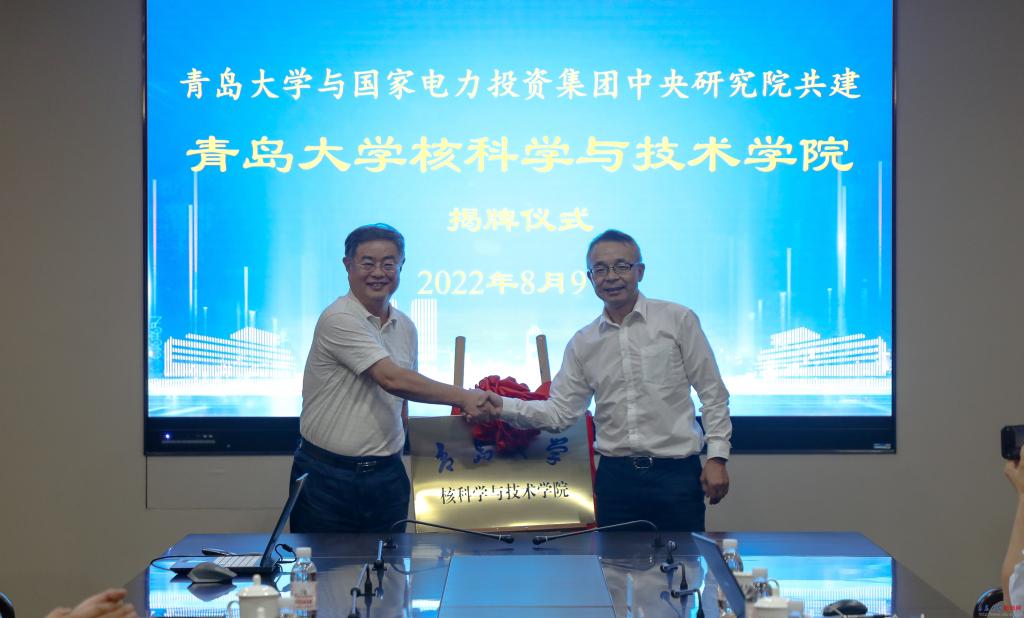 新聞網(wǎng)訊 8月9日,我校與國家電力投資集團中央研究院共建核科學(xué)與技術(shù)學(xué)院揭牌儀式在會議中心致遠廳舉行。國家電投集團中央研究院黨委書記、董事長范霽紅,校長夏東偉出席會議并講話。會議由校黨委常委、副校長于永明主持。儀式上,范霽紅與夏東偉共同為青島大學(xué)核科學(xué)與技術(shù)學(xué)院揭牌。