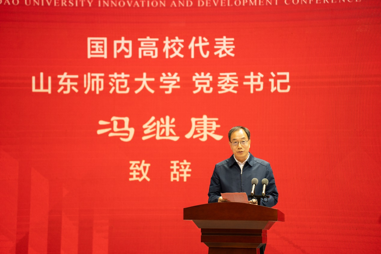 馮繼康作為兄弟高校代表致辭。他表示,山東師范大學與青島大學在長期的合作交流中結下了深厚的情誼。今后的歲月里,山東師范大學愿與青島大學以及其他兄弟高校一道,在省委、省政府的正確領導下,同心協力、并肩攜手、共謀發展、共書新篇,共同鑄造山東高等教育新的輝煌。
