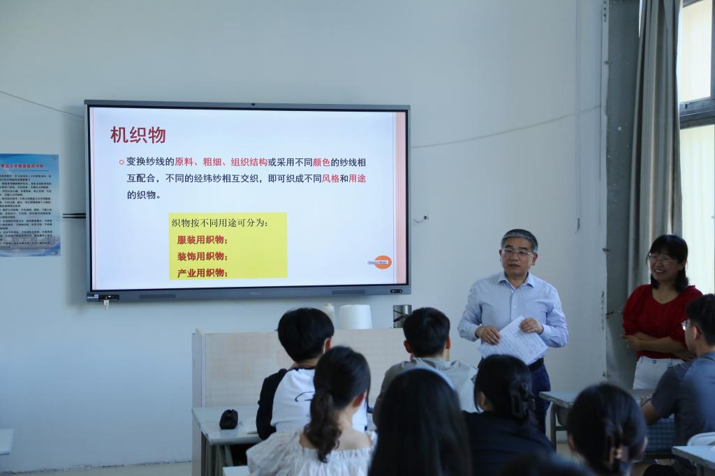 在東12教201教室,校黨委書(shū)記胡金焱和同學(xué)們一起聽(tīng)取紡織服裝學(xué)院教師郭肖青講授的《織造學(xué)》課程。課后胡金焱與師生進(jìn)行了親切交流,胡金焱對(duì)郭老師在備課和課堂表現(xiàn)方面給予了肯定并指出:要打造“金課”需要幾個(gè)方面的努力,一是改變僅由教師灌輸?shù)姆绞剑寣W(xué)生充分的參與到課堂教學(xué)中來(lái),營(yíng)造師生間、學(xué)生間積極互動(dòng)的課堂形態(tài);二是利用教學(xué)網(wǎng)站完善和積累教學(xué)資料、拓展課程維度,建好線上/線下兩個(gè)課堂空間;三是改變“只注重考試結(jié)果”的傳統(tǒng)方式,通過(guò)加強(qiáng)課程過(guò)程化考核,調(diào)動(dòng)學(xué)生參與度和主動(dòng)性,提高課堂效率;四是要加強(qiáng)教師之間的教學(xué)研究交流,安排教師間的教學(xué)觀摩活動(dòng)。最后,胡金焱勉勵(lì)同學(xué)們鍛煉身體、專心讀書(shū),努力成為中國(guó)特色社會(huì)主義合格的建設(shè)者和可靠接班人。