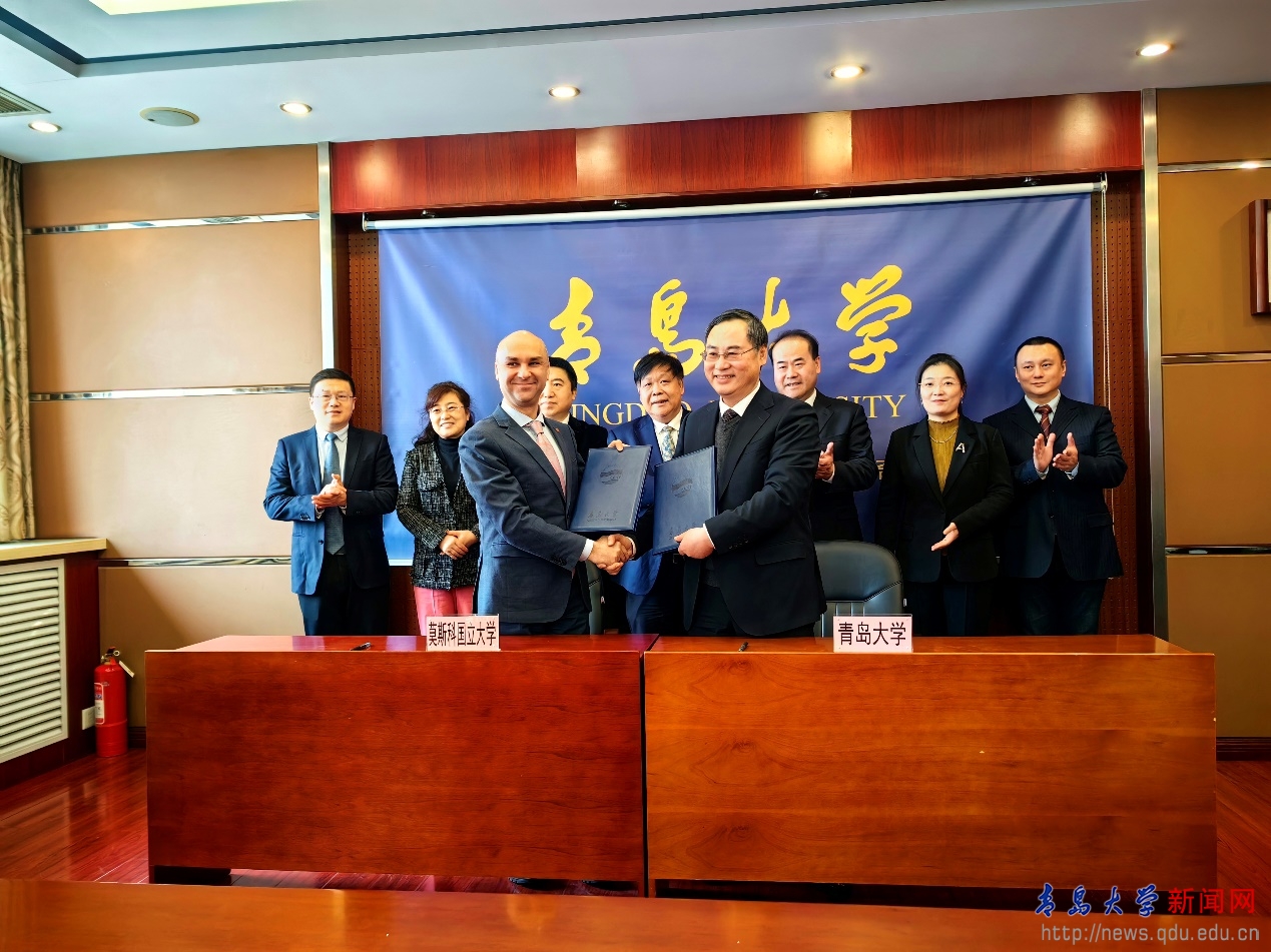 胡金焱對莫斯科國立大學代表團來訪表示熱烈歡迎。他說,2024 年是中俄兩國建交 75 周年,兩國關系已到了前所未有的高質量和高程度,兩國之間各領域合作也迎來新契機,這將為兩校合作提供新的發展機遇。他就今后兩校開展的交流合作提出三項期望,一是依托青島大學作為上合經貿學院實施主體的優勢,兩校聯合發起建設上合組織國家高校合作聯盟,使其成為上合組織國家高等教育合作的重要平臺,打造上合會客廳;二是以項目為牽引,雙方在生物科學等領域開展科研合作,探討聯合共建實驗室等科研平臺;三是探討合作申報中外合作辦學項目,開展學生交流和聯合培養項目。