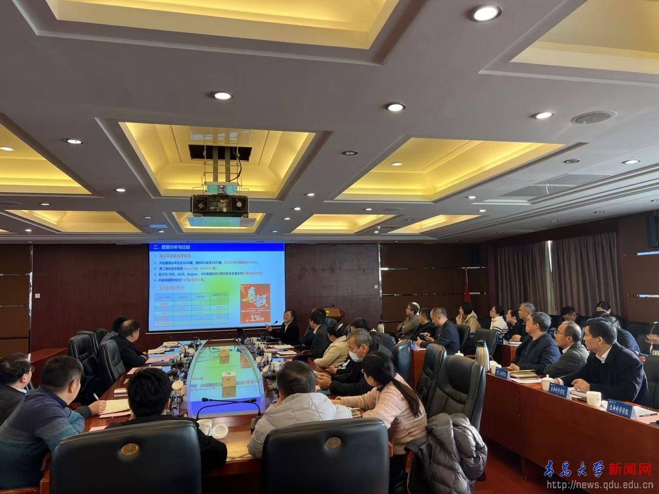 科技處負責人隋坤艷從科研業績數據分析與比較、存在問題與工作思路、下一步主要工作等方面對學校科技工作進行階段性總結與匯報。電子信息學院、機電工程學院、數學與統計學院、化學化工學院、材料科學與工程學院、物理科學學院和青島醫學院作為學院代表在本次科技工作會上依次發言。