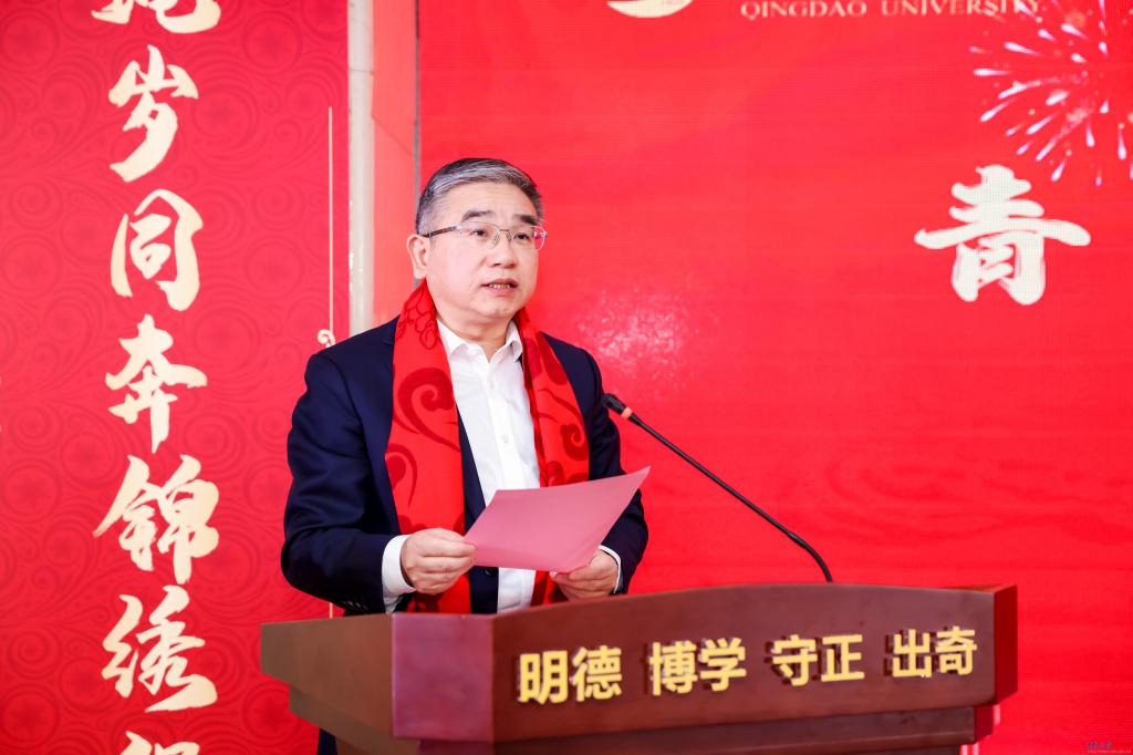 校黨委書記胡金焱致新春賀詞。他指出,2024年學校深入貫徹落實黨的二十大和二十屆二中、三中全會精神,全面落實教育強國和教育強省戰略,聚力轉型發展、創新發展、突破發展,繼往開來,積厚成勢,在高質量發展的道路上奮勇前進。他全面總結了學校過去一年在學科建設、人才培養、科學研究、社會服務、文化傳承創新、國際交流合作等方面取得的成績,通報了學校事業發展取得的標志性突破性成果。胡金焱表示,這一系列辦學成績的取得,離不開每一位青大人的傾情投入、接續奮斗,他代表學校向一年來辛勤工作在教學、科研和服務等各條戰線上的廣大教職員工表示衷心的感謝,向關心學校發展并為學校事業不斷做出新貢獻的老領導、老同志、老專家致以崇高的敬意和新春的祝福。胡金焱強調,2025年是學校全面落實第四次黨代會精神的重要一年,是實現“十四五”規劃目標任務的收官之年,也是全面提升辦學能力、加快推進“雙一流”建設的關鍵一年。學校上下要錨定目標、堅定信心,以敢打必勝的勇氣、久久為功的韌勁,踐行青大人的使命擔當,奮力開創高水平綜合性研究型大學建設新局面。