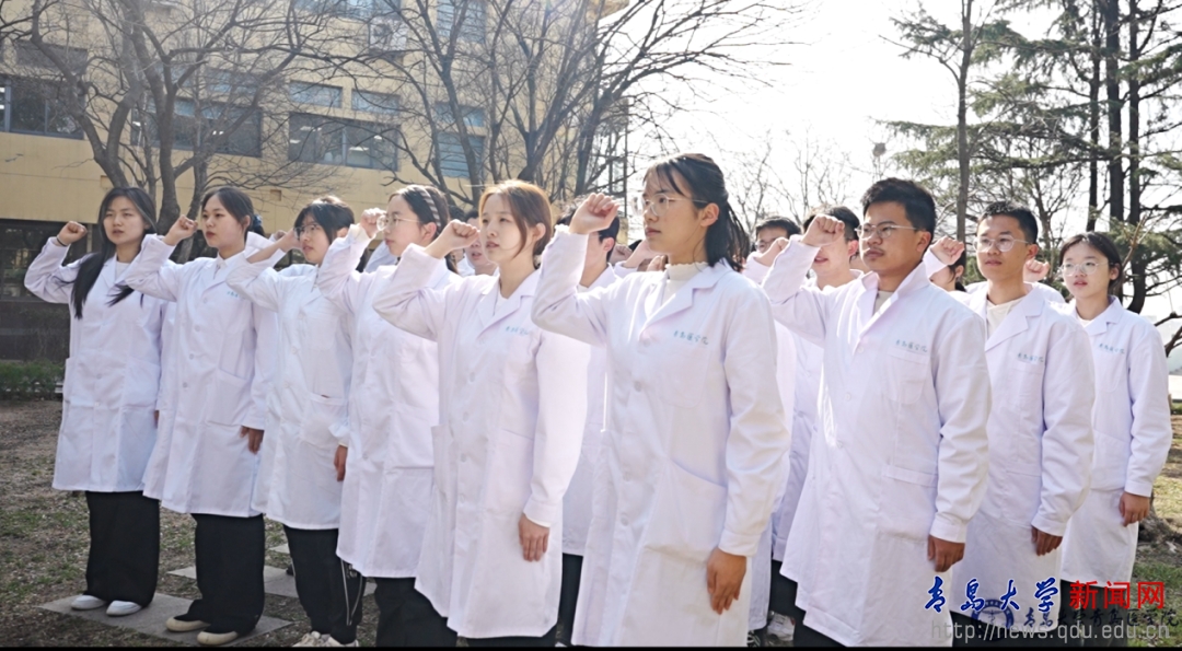 學院2024級臨床醫學(5+3)沈福彭班全體學生,清明節前夕在沈福彭教授紀念碑前舉行紀念儀式,深切緬懷這位為青島大學醫學教育事業做出卓越貢獻的前輩。全班同學身著整潔挺括的白大褂,在班長王銘辰帶領下集體宣讀醫學生誓言。“健康所系,性命相托……”洪亮且堅定的宣誓聲在紀念碑前久久回蕩,不僅承載著同學們對醫學事業的無限熱忱,而且表達了他們對救死扶傷使命的鄭重承諾。 宣誓后,同學們懷著崇敬的心情依次緩步走到紀念碑前,獻上精心準備的黃白菊花和卡片,然后集體鞠躬默哀。