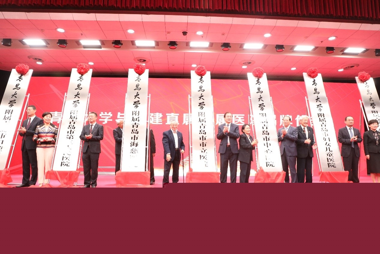 儀式上,在原青島大學醫學院老領導陳在春、郭瑋、唐明、謝俊霞、老教授代表丁世海以及現任青島大學醫學部黨工委書記王新生共同見證下,青島大學醫學部部長姜宏分別與青島市市立醫院院長管軍、青島市中醫醫院(青島市海慈醫院)院長池一凡、青島市中心醫院院長蘭克濤、青島市第三人民醫院院長邢曉博、青島市婦女兒童醫院院長邢泉生、青島市口腔醫院院長王萬春、青島開泰耳鼻喉頭頸外科醫院院長徐欣簽署共建直屬附屬醫院協議,并共同為7家新增直屬附屬醫院揭牌。