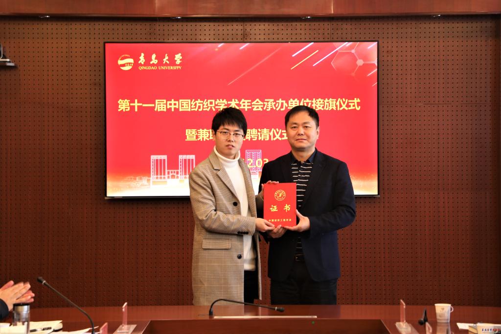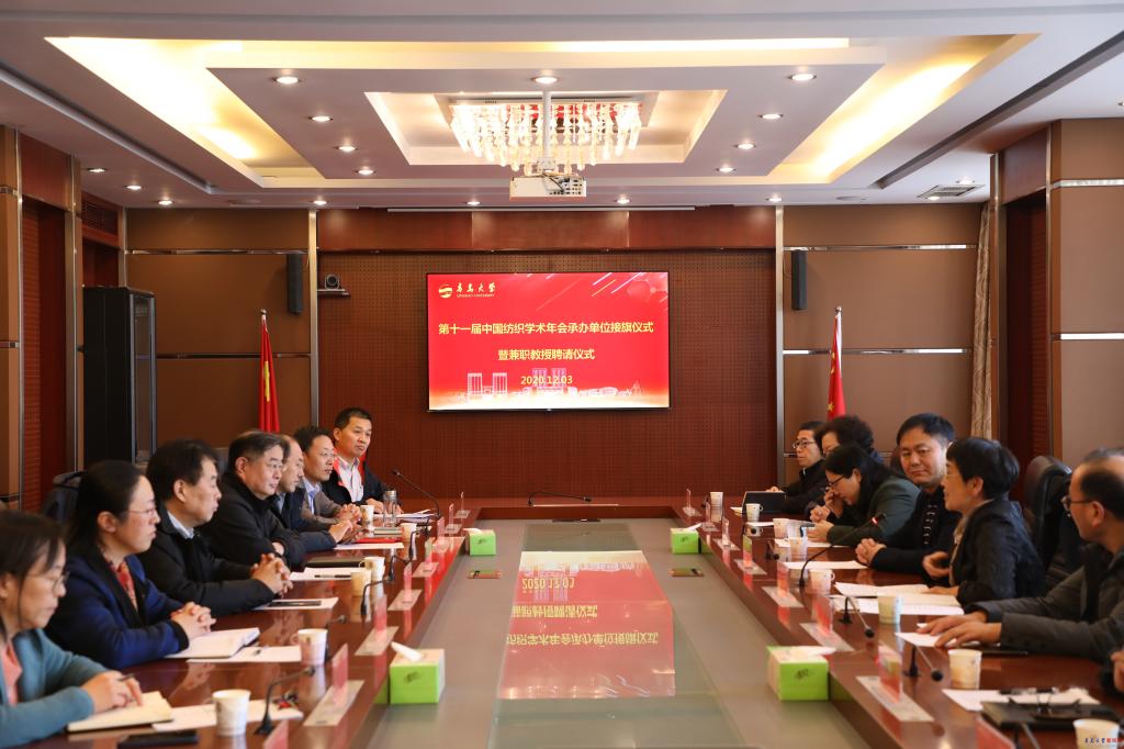 新聞網訊 12月3日,第十一屆中國紡織學術年會承辦單位接旗儀式在我校辦公樓第五會議室舉行。中國紡織工程學會理事長伏廣偉、青島大學校長夏東偉出席接旗儀式。儀式由中國紡織工程學會副理事長尹耐冬主持。夏東偉代表學校從伏廣偉手中接過中國紡織學術年會旗幟,紡織學術年會的“青大時間”正式開啟。