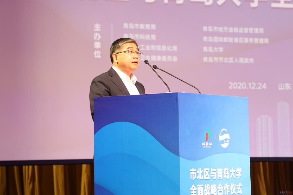 胡金焱在致辭中表示,近期,我們見(jiàn)證了市北區(qū)一輪輪不斷的自我迭代和升級(jí),從5大賽場(chǎng)、17條賽道到“1+6+N”的產(chǎn)業(yè)布局,特別是12月1日,市北區(qū)正式發(fā)布RCEP青島經(jīng)貿(mào)合作先行創(chuàng)新試驗(yàn)基地建設(shè)方案,吹響了老城區(qū)高質(zhì)量發(fā)展的集結(jié)號(hào)。青島大學(xué)學(xué)科門(mén)類(lèi)齊全,人才、科研優(yōu)勢(shì)突出,青島大學(xué)與市北區(qū)政府的合作,具有良好的合作前景,更有共同的合作意愿。在學(xué)校合作發(fā)展處與市北區(qū)產(chǎn)業(yè)發(fā)展專(zhuān)班摸清雙方資源和需求的前提下,合作雙方高度重視、頂格推進(jìn)、多方協(xié)同、成立專(zhuān)班對(duì)接推動(dòng)合作項(xiàng)目,充分發(fā)揮青島大學(xué)企業(yè)家聯(lián)合會(huì)、四方招商產(chǎn)業(yè)發(fā)展有限公司的資源優(yōu)勢(shì)形成政產(chǎn)學(xué)研深度融合的有效合力,力求把論文和科研成果真正寫(xiě)在城市發(fā)展的進(jìn)程中。