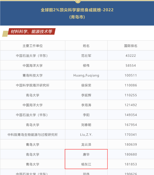 該榜單主要分為“終身科學影響力排行榜(1960-2022)”和“2022年度科學影響力排行榜”兩個榜單。共有7795位國內學者入選全球前2%頂尖科學家“終身榜”,其中,青島大學共有20人上榜。