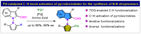 過去幾十年,軸手性化學迎來快速發展,一系列具有C-C或C-N軸的軸手性骨架相繼被發現并實現其不對稱合成。然而,與之相對應的N-N軸手性長期以來一直沒有引起化學家的重視。過渡金屬催化不對稱C?H官能團化是構建手性分子的重要策略之一,通過采用廉價易得的氨基酸作為瞬態輔基(TDG)策略來實現醛的不對稱C-H活化,成為近年來最為成功的C-H活化策略之一。然而,目前該策略對于吡咯C?H鍵官能化構建軸手性化合物仍然是一個挑戰。近日,化學化工學院劉人榮團隊通過TDG策略實現了鈀催化吡咯2位C?H官能團化構建N-N軸手性,為N-N軸手性構建提供了一條新的高效路徑。