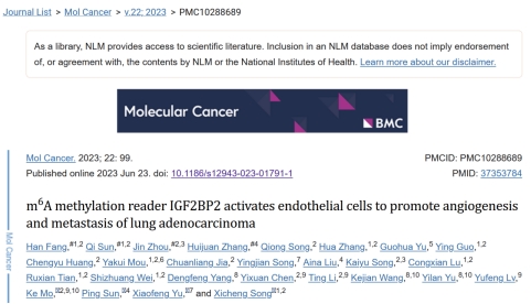 新聞網訊 近日,青島大學附屬煙臺毓璜頂醫院宋西成教授團隊時空單細胞實驗室在《Molecular Cancer》(影響因子IF:37.3,中科院一區,Top期刊)上發表了題為“m6A methylation reader IGF2BP2 activates endothelial cells to promote angiogenesis and metastasis of lung adenocarcinoma”的研究型文章(doi: 10.1186/s12943-023-01791-1),醫學部2022級耳鼻咽喉科學專業型碩士研究生方涵為該文章的第一作者,2020級耳鼻咽喉科學學術型碩士研究生孫奇、煙臺毓璜頂醫院周瑾教授和張惠娟教授為共同第一作者,宋西成教授為本文的第一通訊作者,煙臺毓璜頂醫院胸外科于曉鋒教授、腫瘤內科孫萍教授、時空單細胞實驗室莫客教授為本文的共同通訊作者。