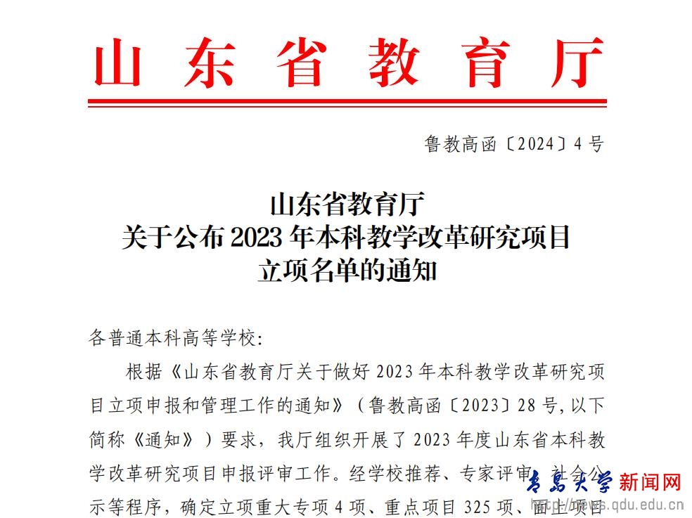 新聞網訊 近日,山東省教育廳公布了2023年省級教學改革研究項目立項名單,我校29項項目獲批立項,其中重點項目15項,面上項目14項,立項數量位居省屬高校第一,全省高校第二。