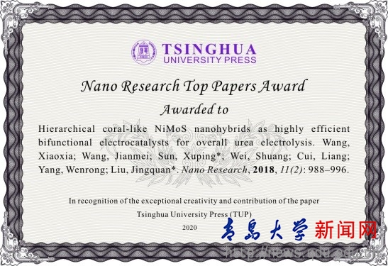 新聞網(wǎng)訊 我校材料科學(xué)與工程學(xué)院劉敬權(quán)教授團(tuán)隊(duì)發(fā)表在Nano Research的研究成果獲2020年“Top Papers Award”的殊榮(每年該獎(jiǎng)只有10項(xiàng)左右)。該團(tuán)隊(duì)在電解尿素水溶液領(lǐng)域以“Hierarchical coral-likeNiMoS nanohybrids as highly efficient bifunctional electrocatalysts for overall urea electrolysis (Nano Res. 2018(2): 988-996,影響因子8.183,被引用46次)”為題發(fā)表的文章引起了同行的廣泛關(guān)注與認(rèn)可,該文章第一作者為材料學(xué)院王曉霞老師,通訊作者為材料學(xué)院劉敬權(quán)教授和四川大學(xué)孫旭平教授。