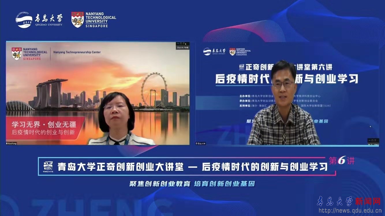 新聞網(wǎng)訊 11月25日下午,由青島大學(xué)創(chuàng)新創(chuàng)業(yè)學(xué)院和新加坡南洋理工大學(xué)南洋科技創(chuàng)業(yè)中心共同主辦的正奇創(chuàng)新創(chuàng)業(yè)大講堂第六講在線上云端順利舉行,南洋理工大學(xué)南洋科技創(chuàng)業(yè)中心EDP主任傅曉方和新加坡南洋理工大學(xué)山東校友會(huì)副會(huì)長(zhǎng)、山東省泰山學(xué)者于廣威作了《后疫情時(shí)代的創(chuàng)新與創(chuàng)業(yè)學(xué)習(xí)》專題報(bào)告。創(chuàng)新創(chuàng)業(yè)學(xué)院常務(wù)副院長(zhǎng)張啟春主持線上報(bào)告會(huì)。