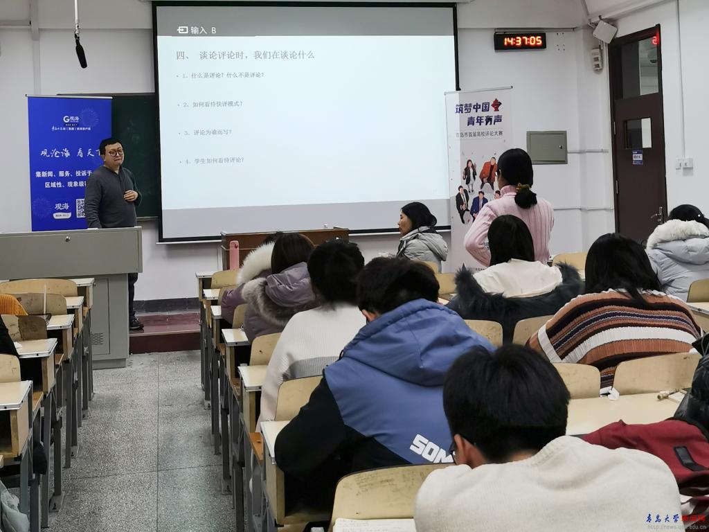 新聞網訊 12月9日,新聞與傳播學院在博知樓舉辦了“互聯網時代評論的可能性”主題講座。本次講座有幸邀請到了青島日報社理論評論部主任鞠培霞和評論員、歷史作家王學義與大家分享新聞評論的經驗,兩位老師耐心解答了同學們在新聞評論創作過程中遇到的困惑。