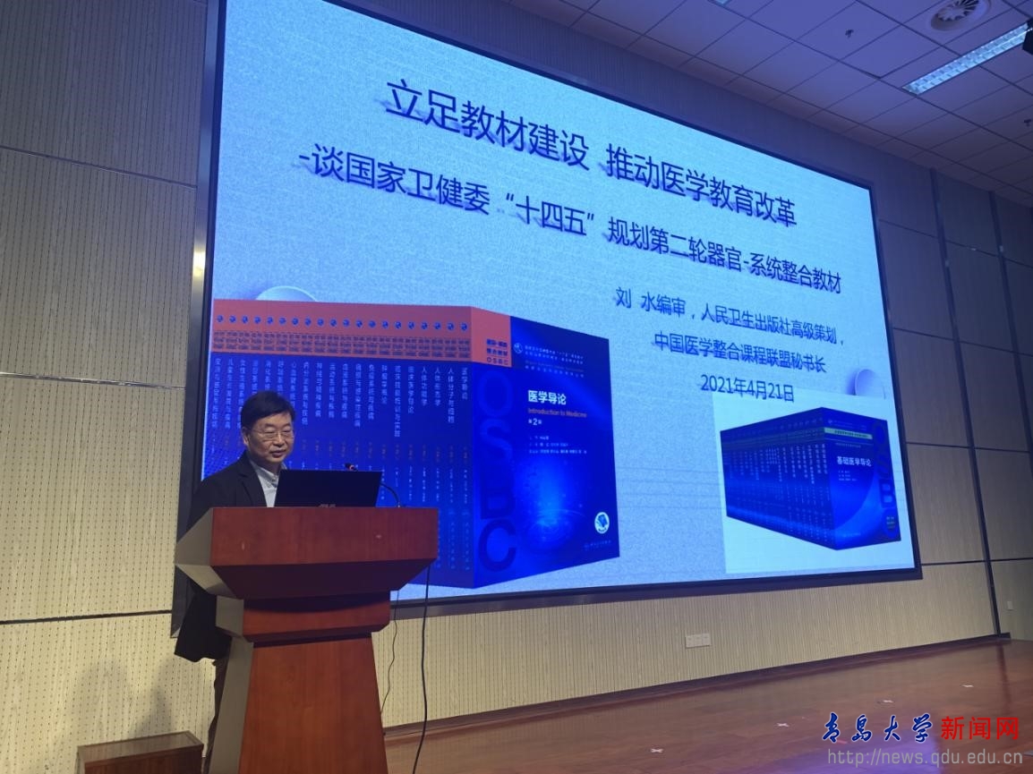青島大學整合醫學教育專家報告會上,朱雙龍做了關于人民衛生出版社發展現狀介紹的報告。他介紹了人民衛生出版社的基本情況,同時表達了對發展醫學教育和系統整合教材的支持。顏虹教授做了題為“堅持立德樹人以新醫科為統領推進醫學教育高質量發展”的主題報告,指出立德樹人是高校的根本任務,要建立以健康為中心的醫學教育模式,并介紹了西安交通大學醫學部器官系統整合課程的改革實踐。曹德品教授做了“醫學教育課程整合發展與再認識”的主旨報告,介紹了哈醫大課程整合的基本情況,指出在醫學教育轉型的關鍵節點,推進醫學多科化與多學科的結構優化、基礎醫學與臨床醫學的融合、人文學科與醫學學科的整合,是醫學教育改革的必然趨勢。建議青島大學綜合考量各種模式,結合本校的醫學教育的實際情況,打好醫學課程整合模式的“組合拳”。人衛社劉水編審做了立足教材建設、推動醫學教育改革的報告。指出教材建設在醫學教育改革具有重要推動作用,介紹了器官系統整合課程教材建設的歷程,以及第二輪器官系統整合教材修訂思路。