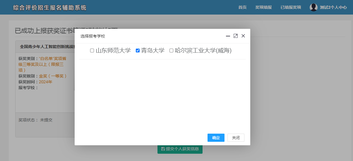 考生所有上報獲獎證書等證明材料,均以“已填報獎項”中顯示的提交成功的獲獎為準。
