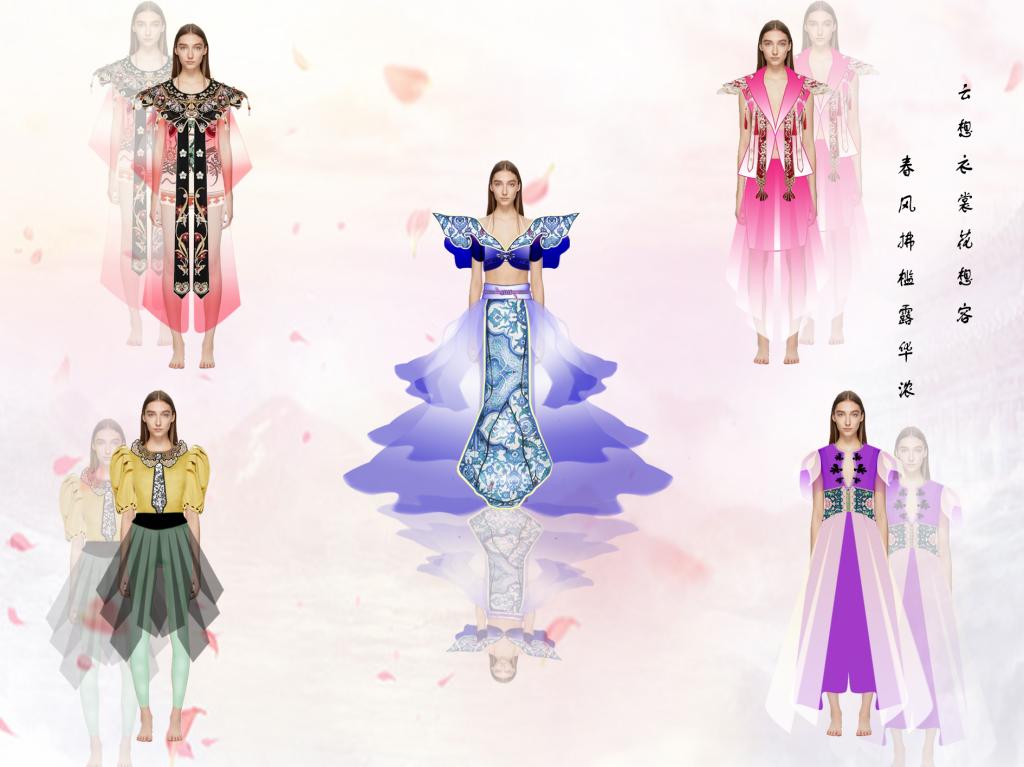 《花想集》系列服裝靈感來源于李白的一句詩“云想衣裳花想容, 春風(fēng)拂檻露華濃”。見云之燦爛想其衣之華艷,見花之艷麗想美人之容貌照人。以云喻衣,以花喻人,是對青春最好的描繪。結(jié)合如今復(fù)古主義的流行趨勢,將云肩、盤扣、袍服等中國元素與漸變、泡泡袖等流行元素相結(jié)合,再用中國傳統(tǒng)花紋圖案加以點(diǎn)綴裝飾。在中國文化和東方文化的基礎(chǔ)上將時尚與中國元素相結(jié)合,塑造出華麗浪漫的服裝風(fēng)格,展現(xiàn)出青春少女獨(dú)有的飄逸靈動的風(fēng)情與活力。這便是對青春如花的最好詮釋。 作品在辛海霞老師的指導(dǎo)下,對《花想集》構(gòu)思的過程進(jìn)行了分析,使設(shè)計(jì)的創(chuàng)意融合本次大賽的設(shè)計(jì)理念,并對設(shè)計(jì)細(xì)節(jié)的處理提出合理意見,最終完成了參賽作品。