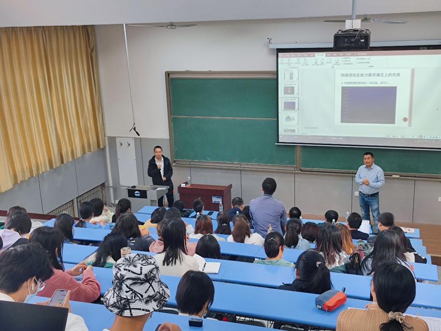 信陽師范學(xué)院魏華副教授應(yīng)邀做了主題為《網(wǎng)絡(luò)游戲,讓我歡喜讓我憂》的學(xué)術(shù)講座。魏華以熱門網(wǎng)絡(luò)游戲?yàn)榍腥朦c(diǎn),向同學(xué)們講述了自己的游戲人生和學(xué)術(shù)人生,介紹了網(wǎng)絡(luò)游戲風(fēng)靡的原因、網(wǎng)絡(luò)游戲成癮的原因及預(yù)防措施,進(jìn)而通過理性地分辨和思考讓同學(xué)們真正了解網(wǎng)絡(luò)游戲這一事物本身性質(zhì)。在此基礎(chǔ)上,他提出防止沉迷于網(wǎng)絡(luò)游戲的建議,幫助同學(xué)們樹立健康、理智應(yīng)對網(wǎng)絡(luò)游戲的態(tài)度,防止沉迷其中。