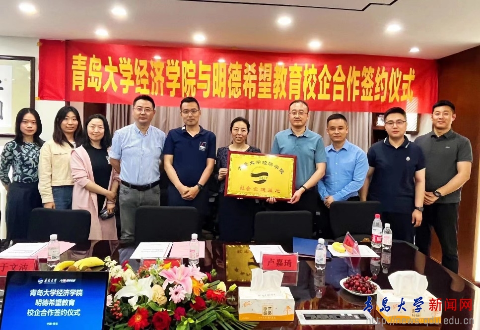富源集團董事長崔文濤、副總裁韓磊、明德希望教育總經理楊言鑫、副總經理司諾、青島校區主任陳之圣陪同學院一行參觀了辦公大樓,隨后在青島富源集團會議室舉行了社會實踐基地簽約掛牌儀式。崔文濤代表富源集團向經濟學院一行表示熱烈歡迎,詳細介紹了集團的發展歷程、業務領域、未來發展規劃以及集團人才培養機制,希望雙方優勢互補,資源共享,拓寬合作領域、創新合作模式,共同培育優秀人才。于文潔向富源集團介紹了經濟學院的發展歷程、學科設置、學生結構、人才培養等情況,希望校企雙方能全面推進科學研究、人才培養等方面的交流合作,提升學院學生就業率、提升學院雙創比賽質量,實現人才輸送、教育和產業互動融合、學校和企業互惠共贏。