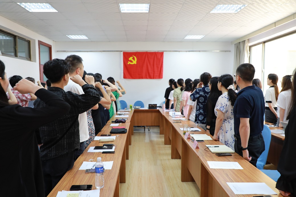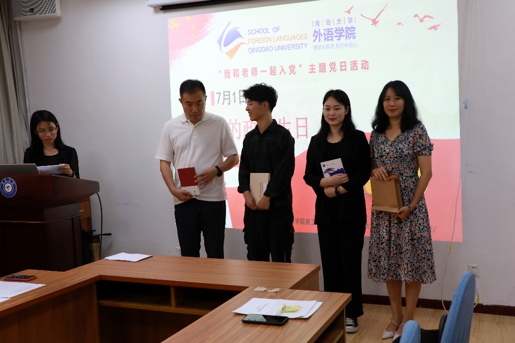 為加強師生支部共建,為支部持續注入青年人才及優秀學生的新鮮力量,增強支部的戰斗力和凝聚力,7月1日上午,外語學院教工第二黨支部與學生第三黨支部于博文樓312會議室共慶七一,接收新黨員,同過第一個“政治生日”。教工第二黨支部接收楊昊、馬一凡兩位老師為中共預備黨員,學生第三黨支部接收程媛媛等碩士生9人、孟婷婷等本科生37人為中共預備黨員。