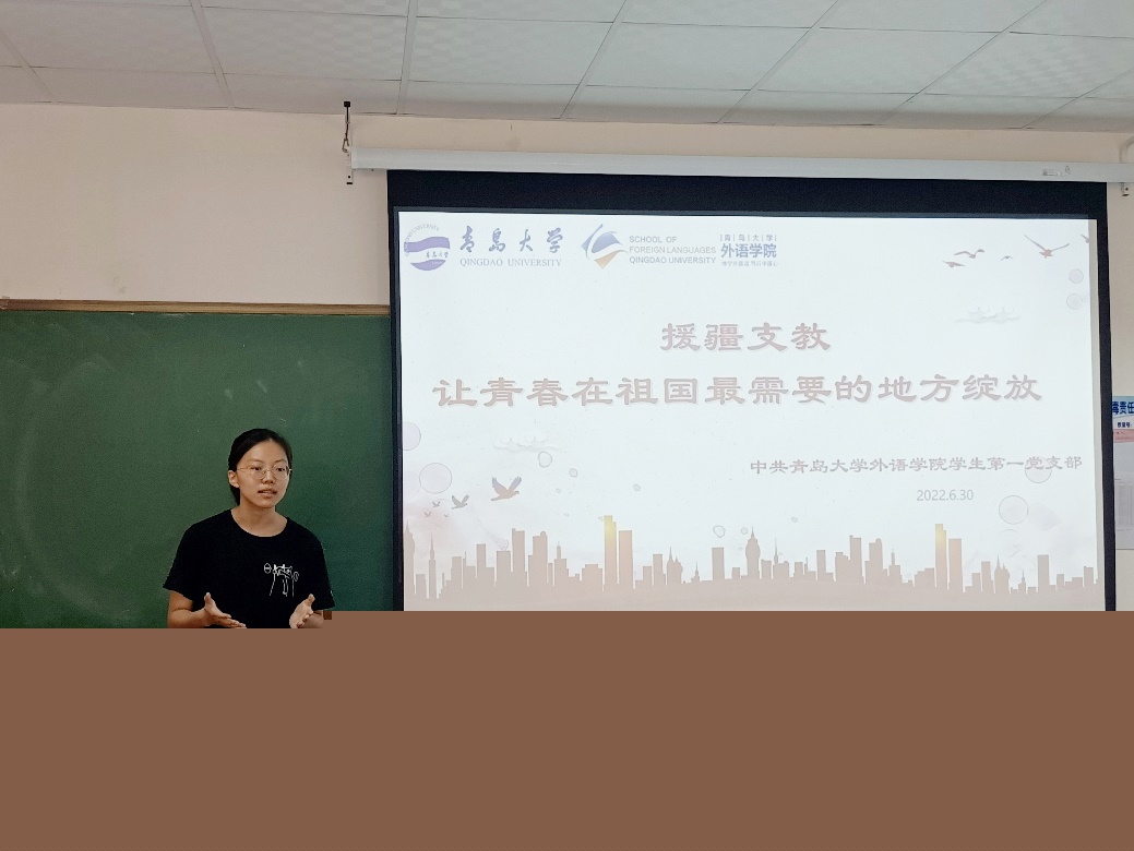 6月30日下午,外語學院學生第一黨支部、學生第二黨支部聯合共建,在博文樓308教室舉辦“援疆支教,讓青春在祖國最需要的地方綻放”主題黨日活動。三位即將前往新疆支教的志愿者王璽、王子瑩和林小鈺依次分享了她們曾經的支教經歷和此次報名的心路歷程。三位志愿者表示,即將到來的遠行,不是為了欣賞沿途的風景,而是為了身體力行,用愛和知識,為孩子們播下一顆顆希望的種子,讓青春在黨和人民最需要的地方綻放。