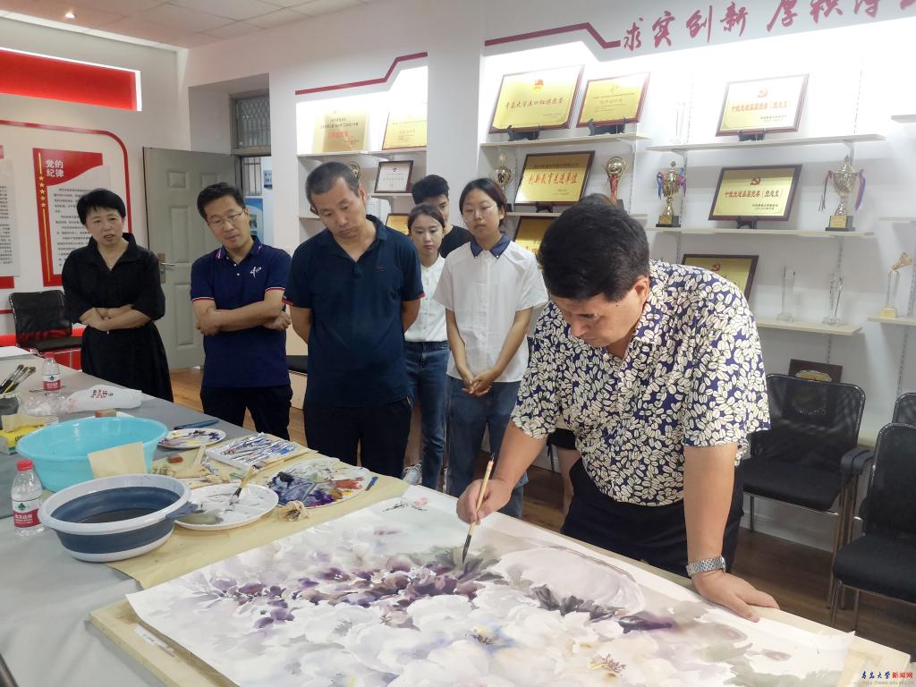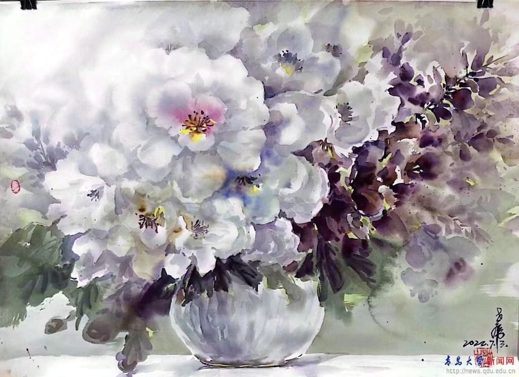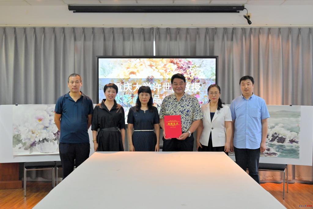 新聞網訊 7月4日下午,應機電工程學院邀請,中國當代藝術名家重慶大學藝術學院許世虎教授在浮山校區(qū)誠思樓211會議室向師生們進行水彩畫示范,通過現(xiàn)場創(chuàng)作讓師生們充分感受水彩之美。許世虎教授將現(xiàn)場創(chuàng)作的兩幅水彩畫作品《濤聲》和《盛開》作為慶祝青島大學合并辦學30周年的禮物捐贈給學校收藏。校黨委常委、副校長劉彩云出席捐贈儀式并代表學校為許世虎教授頒發(fā)了捐贈證書。