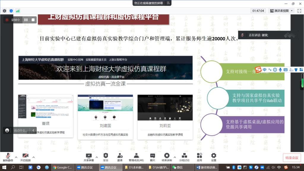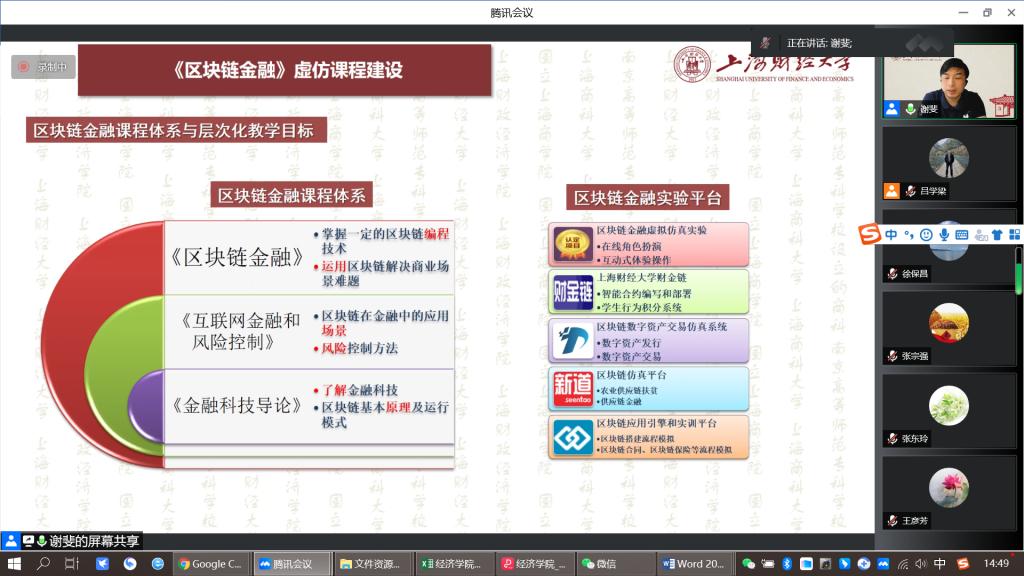 謝斐副主任從全校實驗體系搭建者和國家級“金課”建設者兩個角度,先后介紹了國家級虛擬仿真一流課程申報動向、《區塊鏈金融》虛仿課程建設經驗、國家級虛仿一流課程申報歷程、上財虛擬仿真課程群和虛仿課程平臺建設現狀等多方面的內容。謝斐副主任的報告精彩紛呈,既有頂層設計的邏輯思考,又有課程建設的實踐細節,既有對經驗的系統總結,又有對未來的科學規劃,引發了參會者的強烈共鳴和熱烈討論,使大家受益匪淺。