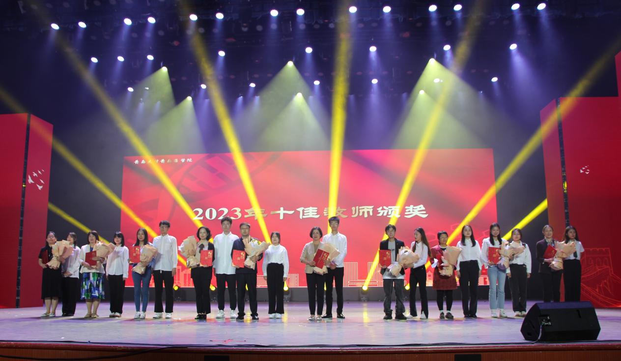 晚會(huì)前期,為感謝各位教師的辛勤付出,經(jīng)過精心設(shè)計(jì)、廣泛征集,評(píng)選出沈若武、張皓、閆志勇、李琦、董靜、璩竹玲、薛雁、項(xiàng)鋒鋼、滕雷、陳蕾十位最受學(xué)生喜愛的“十佳教師”。晚會(huì)上,十位教師上臺(tái)領(lǐng)獎(jiǎng),并為同學(xué)們送上了最真摯的祝福。
