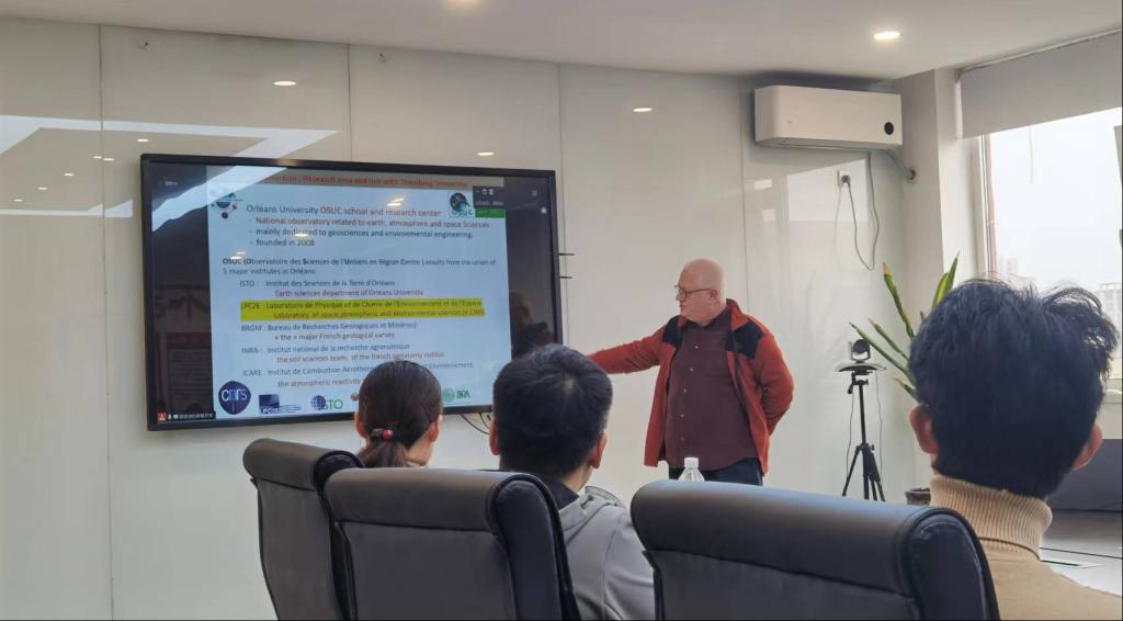 Christophe講授了通過δ13C監(jiān)測(cè)地表CO2排放,并對(duì)土壤含水層中石油碳?xì)浠衔锷锝到鈩?dòng)力學(xué)進(jìn)行分析的方法。會(huì)后,Guimbaud與在場(chǎng)師生進(jìn)行了互動(dòng)交流,耐心解答相關(guān)問題,學(xué)生踴躍提問,現(xiàn)場(chǎng)氣氛熱烈。