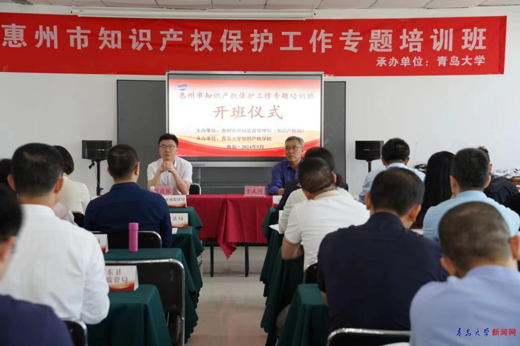 新聞網訊 5月27日至31日,由青島大學知識產權學院承辦的“惠州市知識產權保護工作專題培訓班”在我校順利舉辦。惠州市各縣(區)政府分管負責人和市場監管局(知識產權局)主要負責人、市直有關單位分管負責人、市場監管局負責人及相關科室負責人共40余人參加了此次培訓。