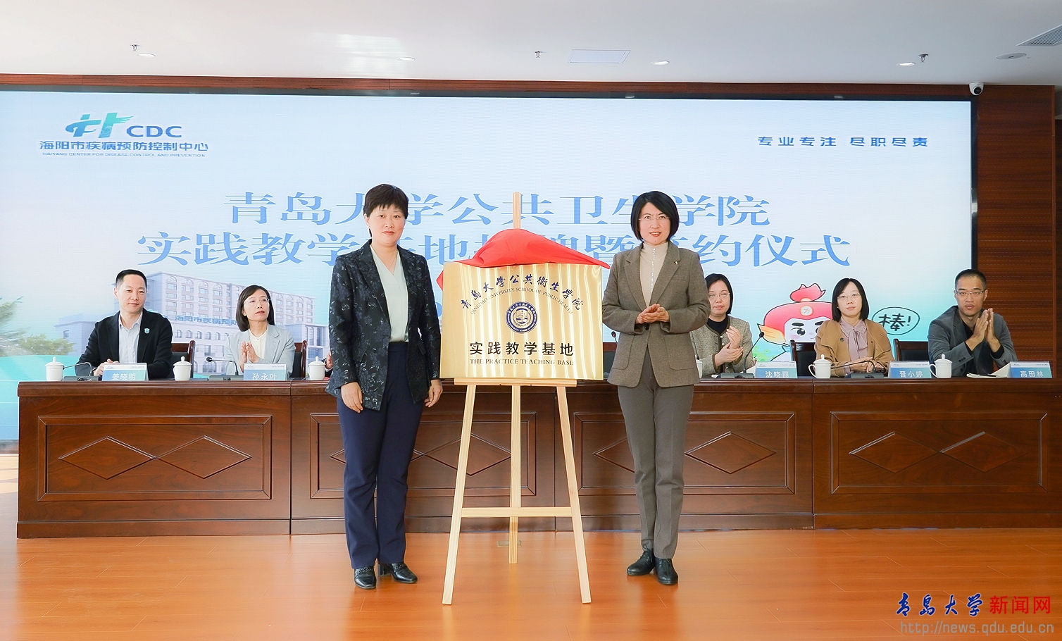 賈依娜在致辭中重點介紹了青島大學及公共衛生學院的發展歷程、教育教學、師資隊伍和學科建設等基本情況,并表示今后將與海陽市疾控中心攜手共進,共同探索公共衛生教學科研和人才培養新范式,為促進高校與地方的合作共贏創造新的機遇,產出更多惠及社會的成果。賈依娜與倪永妮一起,為教學實踐基地揭牌。