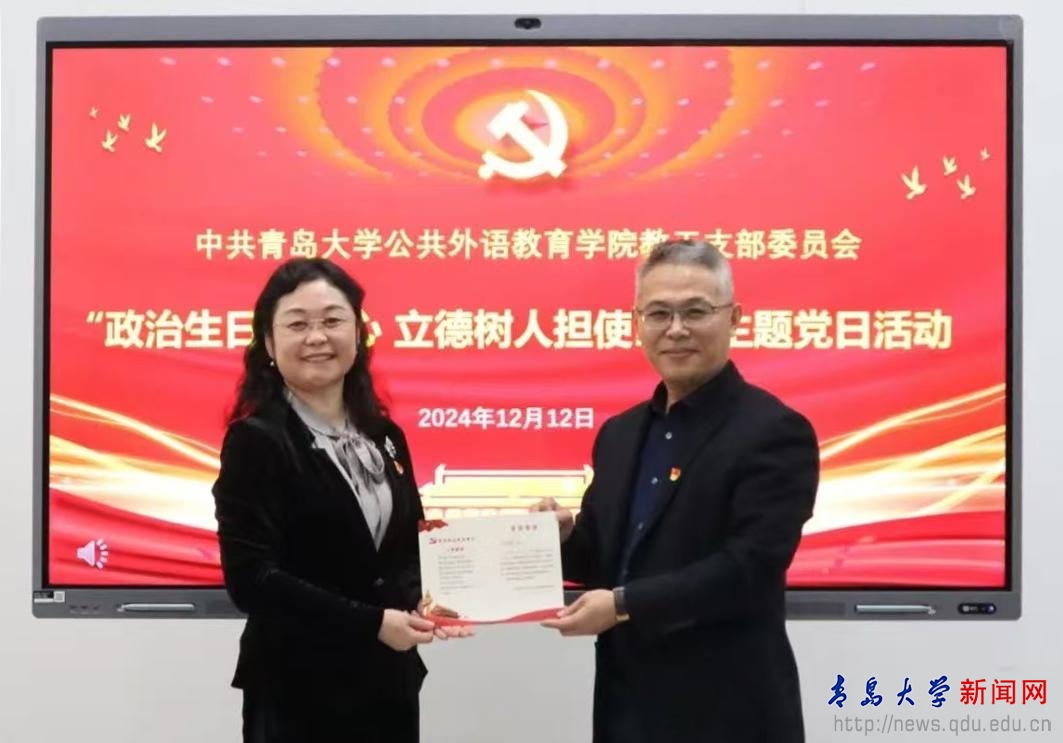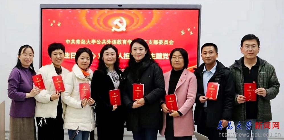 新聞網訊 為進一步加強黨的建設,強化黨員教師的黨員意識、責任意識和宗旨意識,近日,公共外語教育學院教工黨支部舉辦 “政治生日憶初心 立德樹人擔使命”主題黨日活動,為第四季度入黨的黨員教師慶祝政治生日。本次主題黨日活動由“五個一”組成,即學習一次黨的知識,贈送一張生日賀卡,重溫一次入黨誓詞,分享一次初心感言,留存一份美好記憶。主題黨日活動由學院黨委委員、教工第三黨支部書記李曉敏主持,學院全體教工黨員參加。