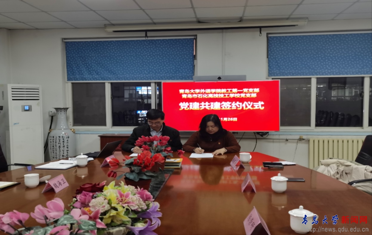 共建活動遵循“平等協作、共商共贏”的原則,雙方黨支部書記分別介紹了各自組織的基本情況,并就資源共享和交流、生活互融、優勢互補和志愿服務、文化活動等方面達成了共識。外語學院教工第一黨支部與青島市石化高級技工學校黨支部在共建簽約儀式上正式達成合作。