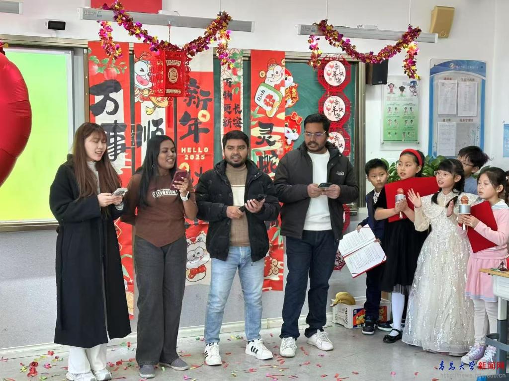 來(lái)自越南、印度、孟加拉國(guó)的4名留學(xué)生參加了青島市中外人文交流實(shí)驗(yàn)學(xué)校--嶗山區(qū)麥島路小學(xué)三年級(jí)元旦文藝聯(lián)歡暨國(guó)際理解日活動(dòng),除了觀看節(jié)目展演以外,還與小學(xué)生們共同演唱迎新年英文歌曲,共同迎接新年的到來(lái)。