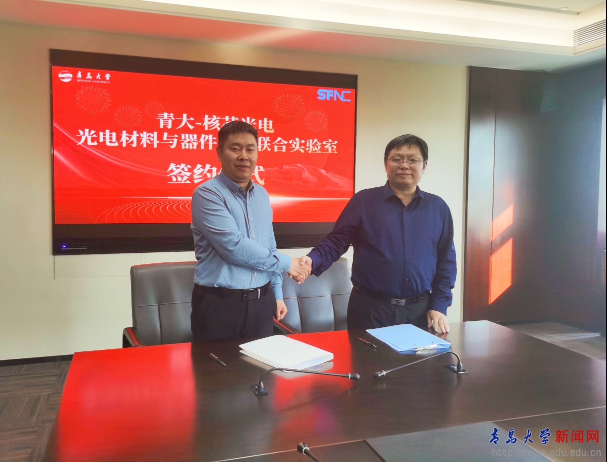 座談會上,黃林軍和曹學蕾共同簽署《青島-核芯光電材料與器件創新聯合實驗室共建協議》。