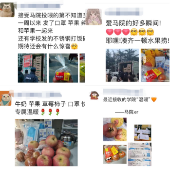 按照學校疫情防控要求,學院有序組織開展愛心物資發放工作。各宿舍代表在值班老師的帶領下領取新一波的“驚喜”,收到物資的同學們紛紛在朋友圈曬起學院的溫暖,表達對愛心企業和學院的感謝。還有同學調侃道“手上有糧,心中不慌,安心在學校長胖。”