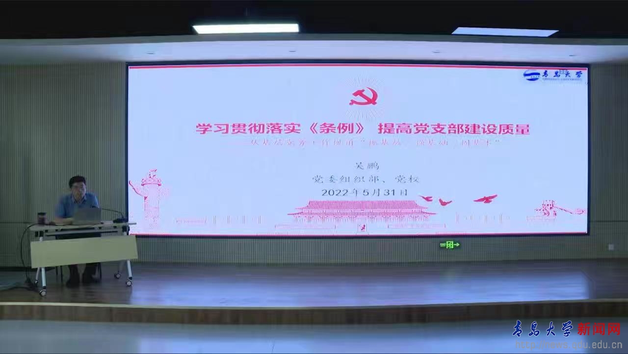 黨委組織部副部長、黨校常務(wù)副校長吳鵬以“學(xué)習(xí)貫徹落實(shí)《條例》 提高黨支部建設(shè)質(zhì)量”為題,結(jié)合相關(guān)政策文件、工作條例和實(shí)際案例,分別從“學(xué)習(xí)貫徹高校基層組織工作條例”“推動黨支部建設(shè)的標(biāo)準(zhǔn)化規(guī)范化”“高質(zhì)量開展黨支部換屆選舉工作”三個方面進(jìn)行了講解。他講到,黨支部是高校教育和管理黨員的基本單位,抓好了黨支部建設(shè)就抓好了高校黨建工作的基礎(chǔ)一環(huán)。要堅持把黨支部建在教研團(tuán)隊上、建在班級課堂上,確保教育、科研、管理、服務(wù)推進(jìn)到哪里、黨支部的戰(zhàn)斗堡壘作用就體現(xiàn)在哪里,寓黨建于服務(wù)之中。