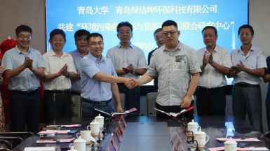 于永明副校長與李紹坤董事長為“聯(lián)合研究中心”揭牌。我校環(huán)境科學(xué)與工程學(xué)院陳光輝副教授與青島綠潔坤環(huán)保科技有限公司李佳麟總經(jīng)理簽訂《青島大學(xué)-青島綠潔坤環(huán)保科技有限公司共建“環(huán)境污染物控制與資源化利用聯(lián)合研究中心”合作協(xié)議》。
