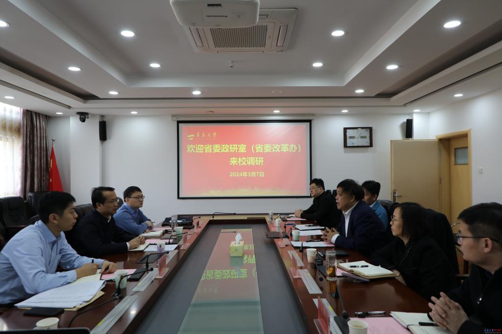 新聞網訊 3月7日上午,省委政研室(省委改革辦)制度創新處處長李銳一行來校開展教育科技人才協同發展機制調研,副校長李榮貴在辦公樓第三會議室會見并座談交流。