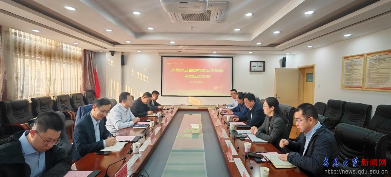 新聞網訊 4月9日下午,曲阜師范大學副校長紀洪濤一行5人來我校調研交流國內合作、基礎建設、安全管理等工作。座談會在辦公樓306會議室舉行,校黨委常委、副校長陳濤出席座談會。