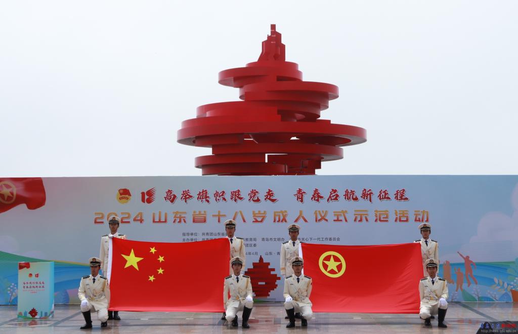 新聞網訊 4月28日,由共青團山東省委指導,共青團青島市委、青島市教育局、青島市文明辦、青島市關工委主辦,市教育局團委、市南團區委承辦的“高舉旗幟跟黨走 青春啟航新征程”2024山東省十八歲成人儀式示范活動在青島五四廣場舉行,青島大學國旗班(浮山校區)亮相活動現場,展現青春力量,見證又一批年輕人為青春加冕。