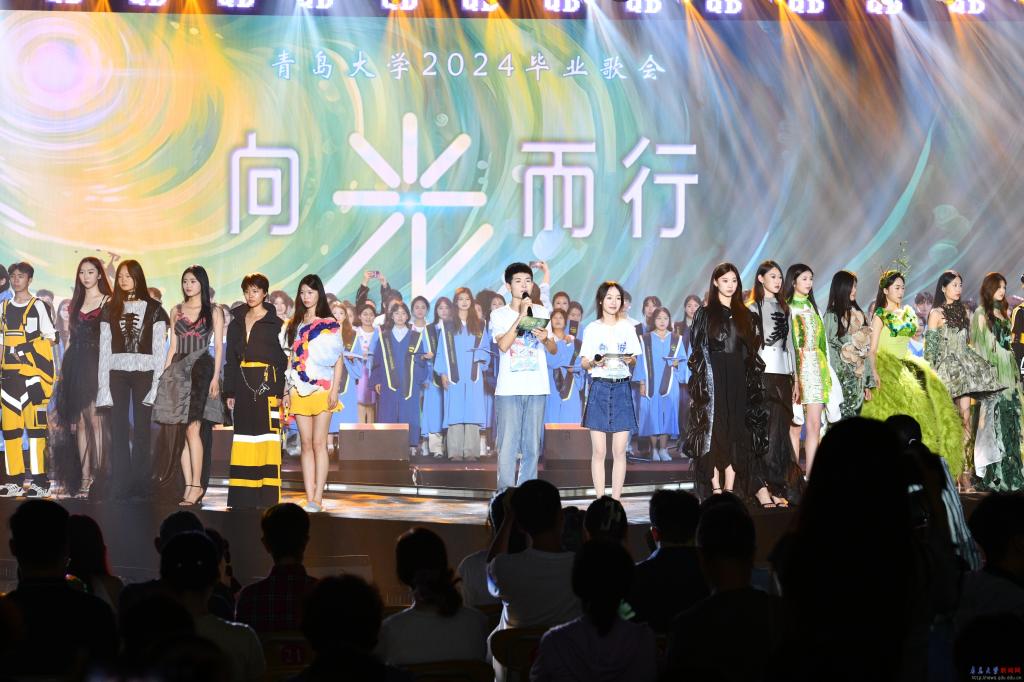 今年畢業歌會由共青團青島大學委員會與紡織服裝學院聯合主辦,使節目形式實現創新突破。除了運用樂團、電聲樂隊、情景演唱、舞蹈、朗誦等豐富的表演形式,還將歌曲與走秀巧妙搭配,形成音樂與時尚的綜合表演。畢業生們身著紡織服裝學院畢業生精心設計的作品,走在T臺上,每一步都流露出對未來的自信與憧憬。