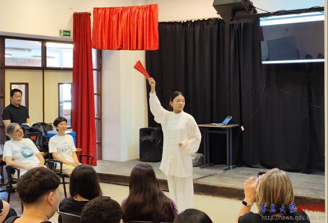 活動開始,孔子學院院長郭梅發表了致辭。她簡單介紹了孔子學院,強調了文化交流的重要性,并希望學生們在學習漢語和了解中國文化的過程中有所收獲。隨后,崔新茹老師表演了太極扇,她的動作行云流水,展示了太極的柔中帶剛、靜中有動的特點,受到了師生們的贊賞。接下來,王烈陳老師展示了中國書法藝術,并為學生們寫下了中文名字。在展示過程中,王老師還講解了漢字的含義和書寫技巧,學生們感受到了書法藝術的博大精深。隨后,李宇昊老師帶來了一場漢語公開課,教授學生們基礎漢語知識,讓學生們對漢語的拼音和漢字有了基本的認識。在互動環節中,崔欣茹老師帶領學生們踢毽子,并講解了中國傳統游戲的文化背景。