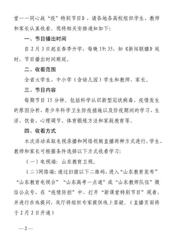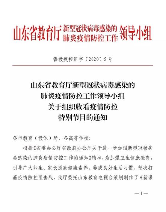 附:《山東省教育廳新型冠狀病毒感染的肺炎疫情防控工作小組關(guān)于組織收看疫情防控特別節(jié)目的通知》(魯教疫控組字[2020]5號(hào))文件